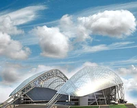 The stadium walls and roof is one continuous glass surface designed to reflect sunlight off the sea during the day. The bowl opens to the north, allowing for a direct view of the Krasnaya Polyana Mountains, and the upper deck is open to the south, allowing for a view of the Black Sea. The stadium is designed by global leaders of sports architecture Populous and UK design consultancy Buro Happold. The final design was unveiled in September 2009.